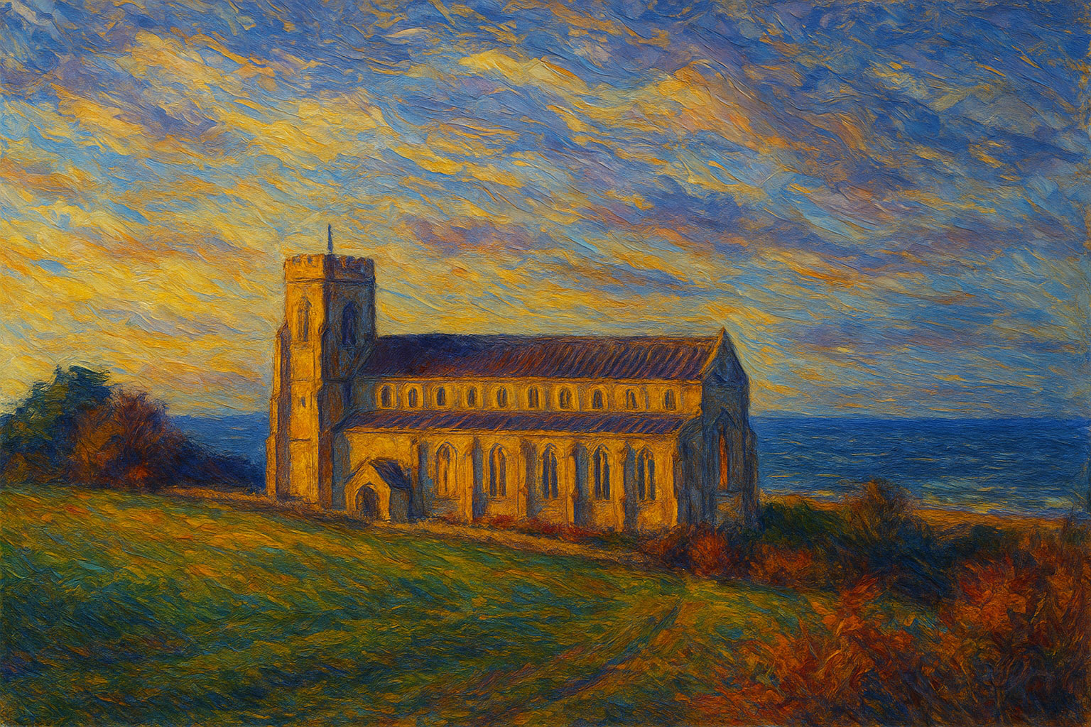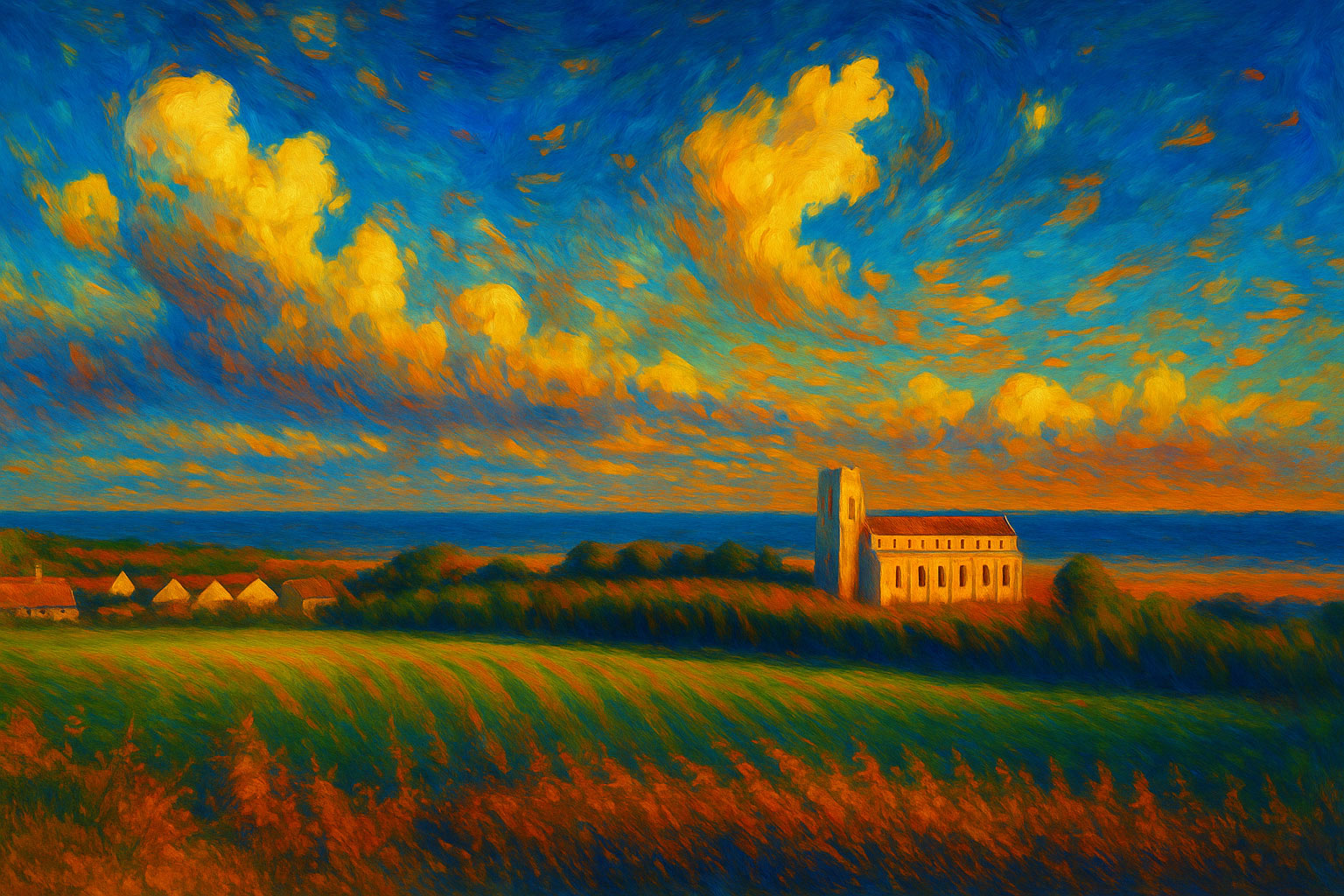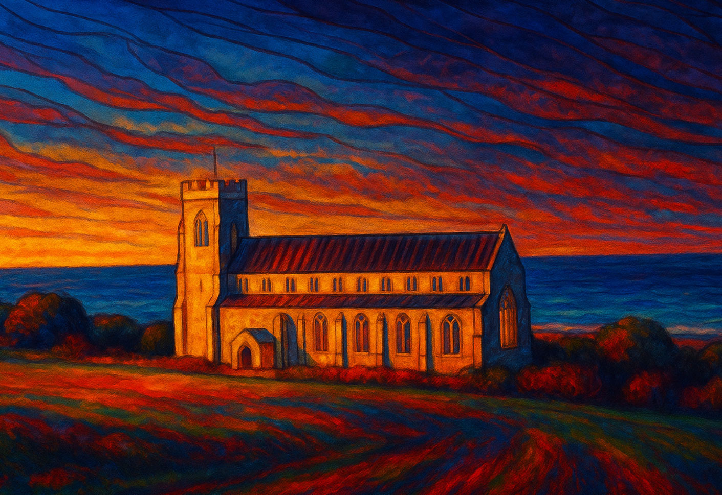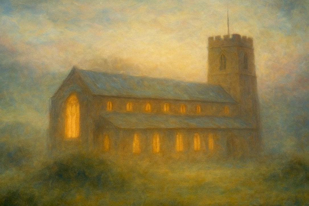 Mist & Memory: A soft veil of morning mist dissolves the edges of the church, leaving only warmth and memory glowing through the windows.